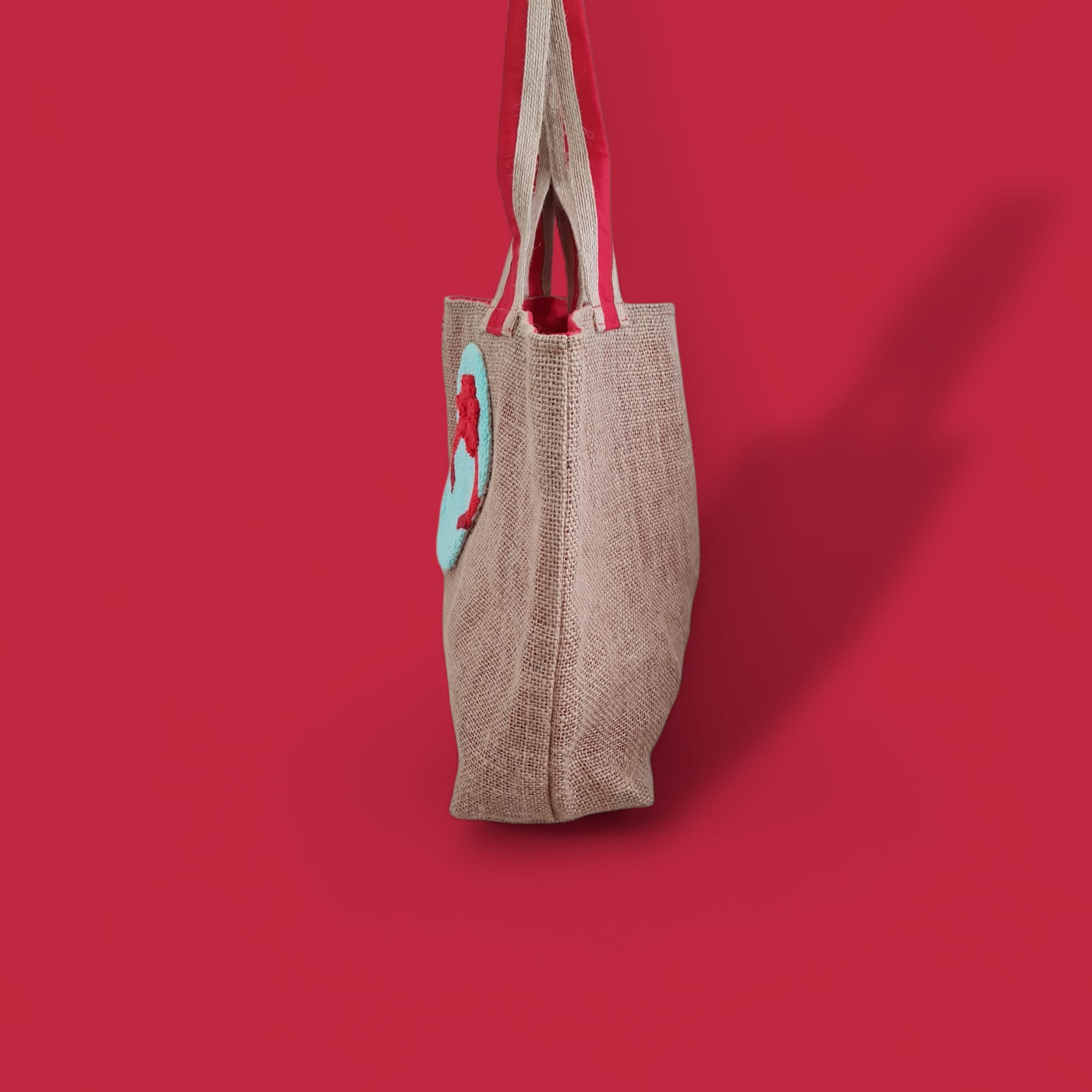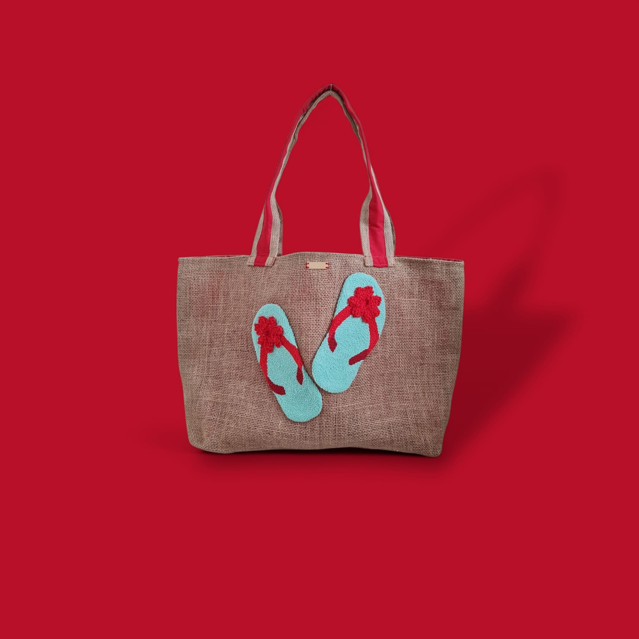 🌞 Doğal jüt kumaş üzerine Punch tekniğiyle işlenmiş rengarenk plaj terliği deseniyle, yazın enerjisini yansıtan özgün bir tasarım!