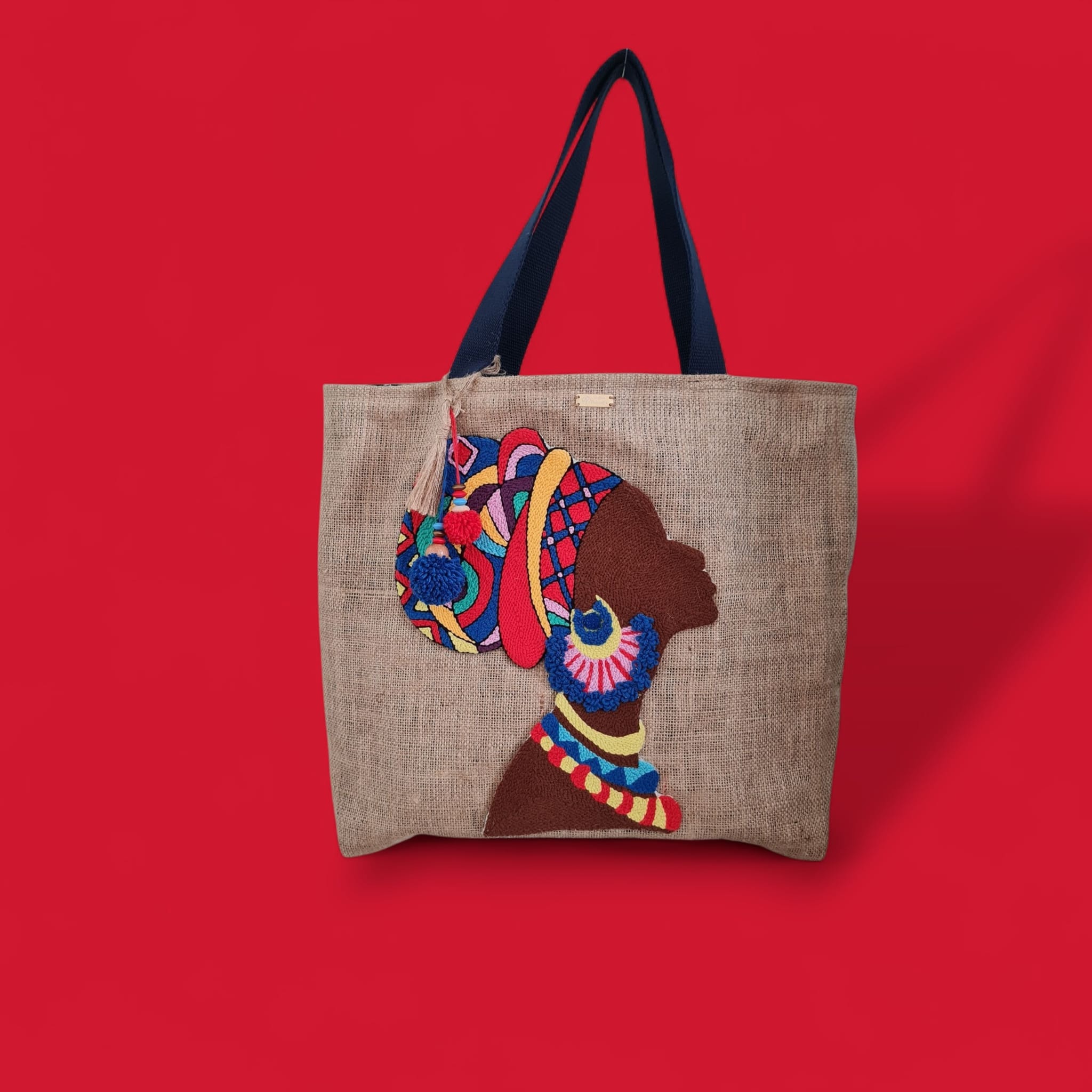 Doğal jüt kumaş üzerine, renkli iplerle işlediğim Afrikalı kadın profili; gücü, özgünlüğü ve sanatı çantanda taşıyor.